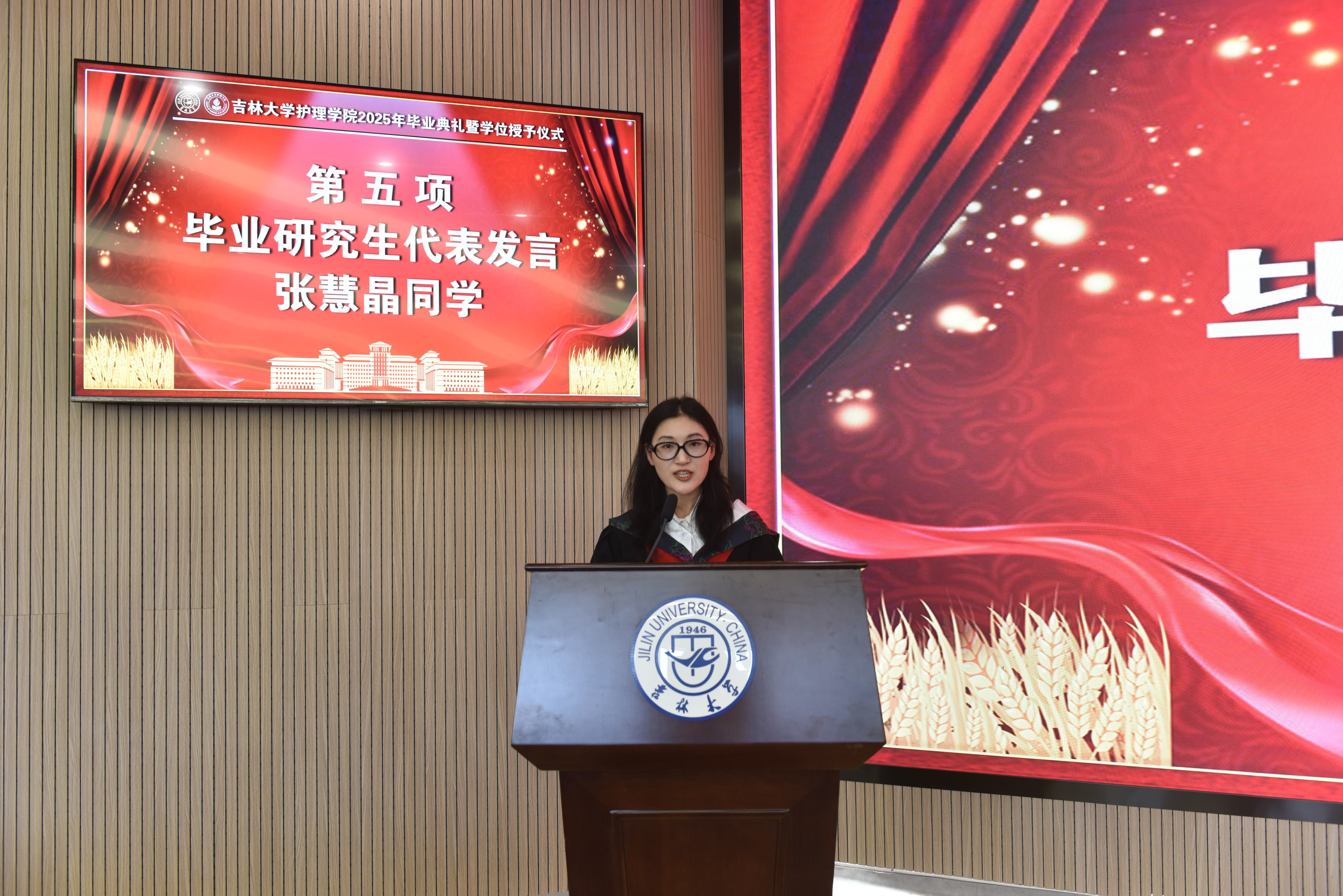 随后,毕业研究生代表张慧晶和毕业本科生代表吴季桐发言,回忆求学期间的成长和感悟,深切表达了对学院、老师及同窗的深情厚谊。教师代表尹惠茹老师发言,诚挚祝愿全体毕业生带着持续学习的能力、迅速行动的习惯、张弛有度的智慧、重新出发的勇气奔赴人生的下一站。