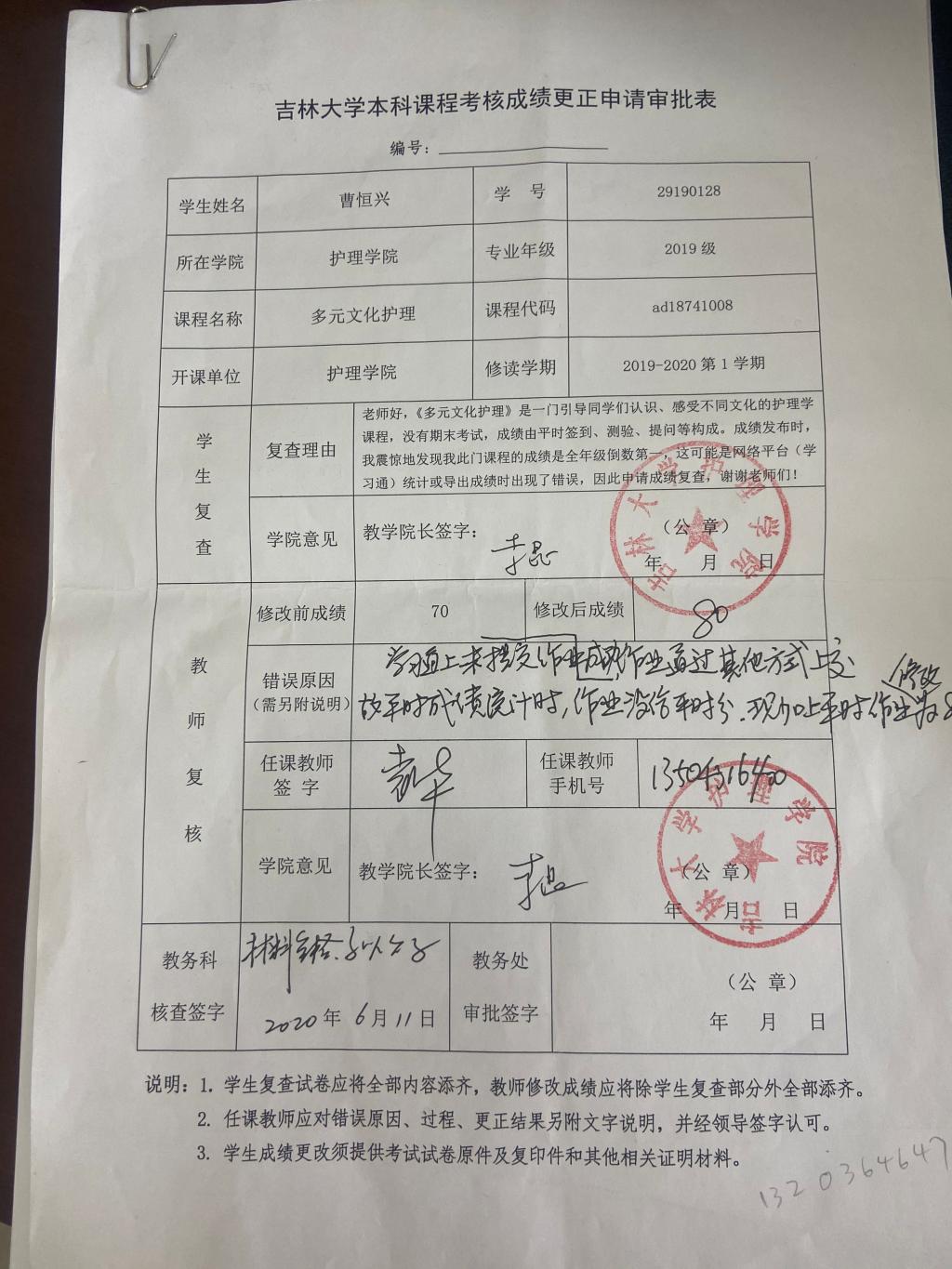 根据《关于进一步明确本科生课程考核等有关问题的通知》(校教字〔2018〕47号)文件有关精神,现对新葡萄官网AMG2019级曹恒兴同学(学号:29190128)2019-2020-1学期课程成绩更正如下: