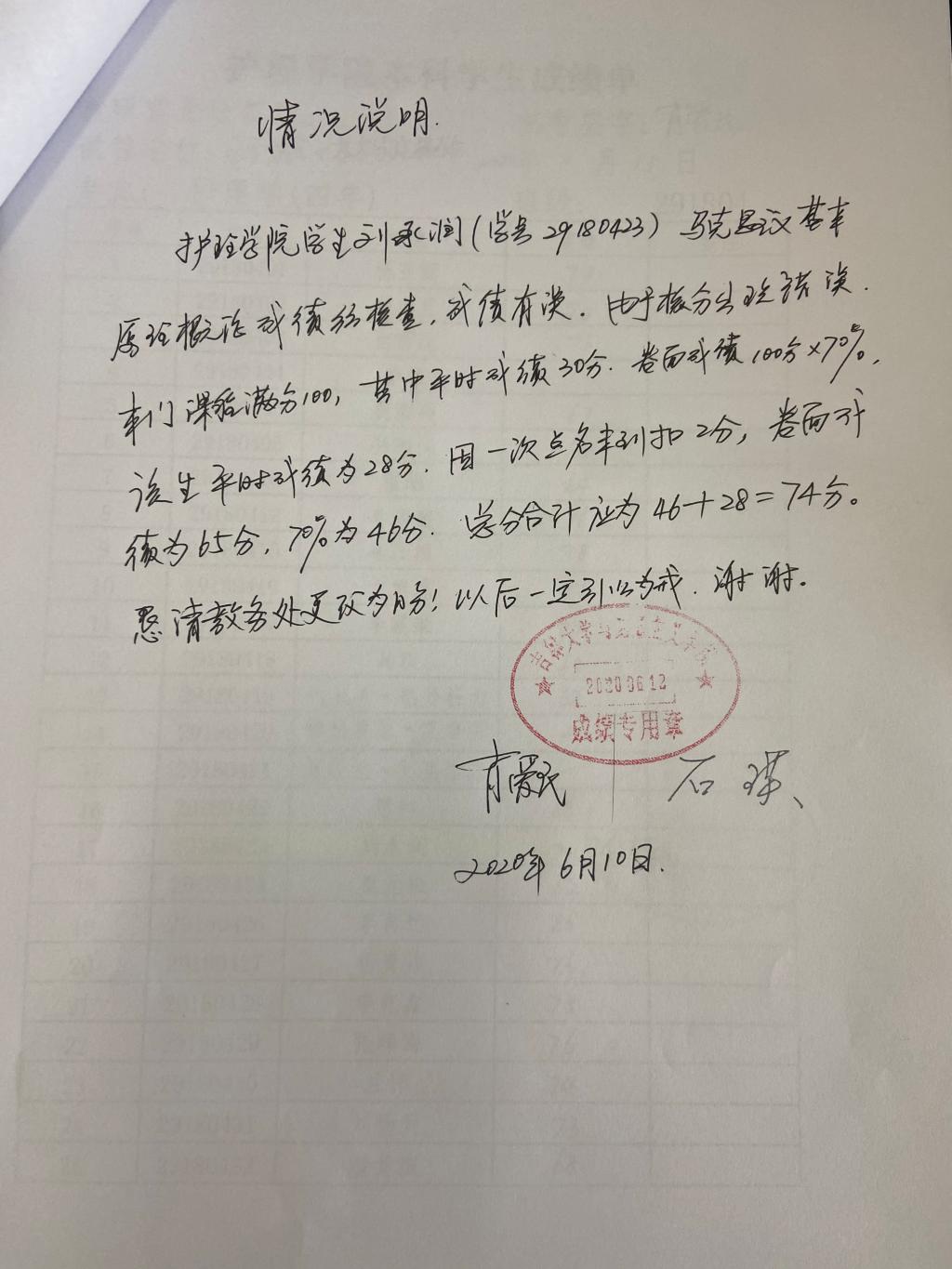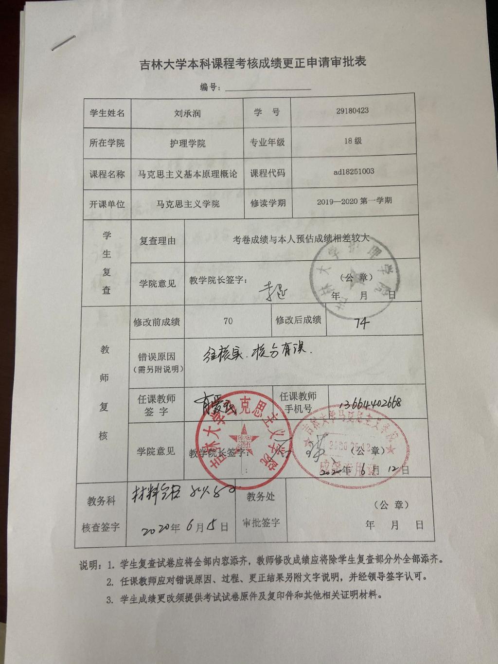 根据《关于进一步明确本科生课程考核等有关问题的通知》(校教字〔2018〕47号)文件有关精神,现对新葡萄官网AMG2018级刘承润同学(学号:29180423)2019-2020-1学期课程成绩更正如下: