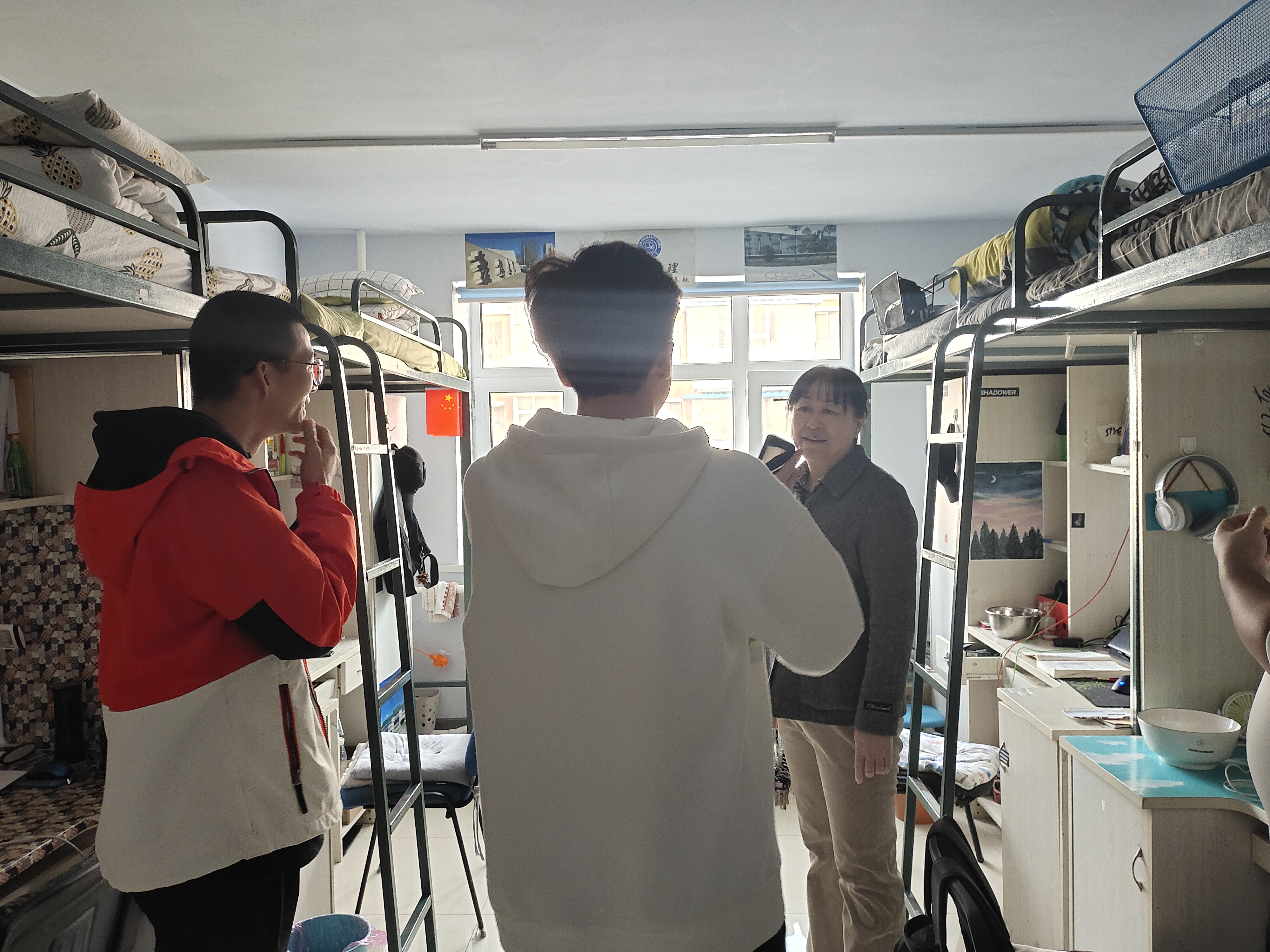 在学生寝室,辅导员查看寝室卫生,排查安全隐患。叮嘱大家保持卫生,保证安全,杜绝违章用电,勤通风,按时完成测温签到打卡,做好常态化疫情防疫工作。鼓励学生在新学期制定计划、努力学习、发展特长,切实提高自己的专业知识和综合素质;针对大一学生,了解学生转专业情况,做好学生思想稳定工作;针对毕业生,了解学生就业、考研情况,帮助学生分析就业形势,希望有考研复试资格学生认真准备,学院将为复试学生提供场地、设备帮助。同时,对于同学们提出的问题,辅导员们也都一一解答。